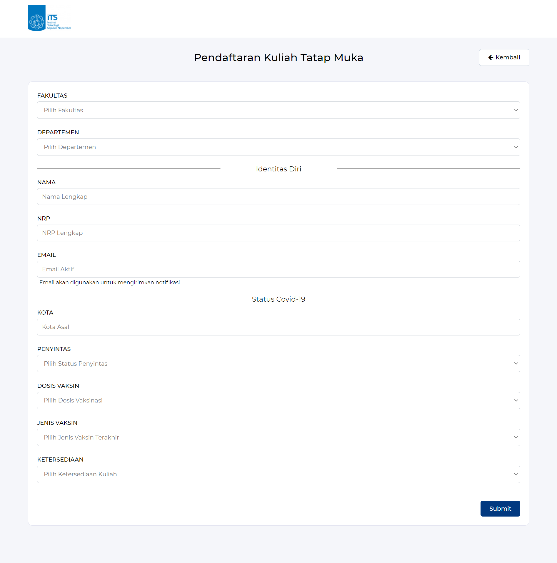 Pada pertemuan PWEB minggu lalu, saya diminta untuk membuat website pendaftaran kuliah tatap muka yang merupakan formulir validasi yang tidak dapat di-submit hingga seluruh datanya terisi. Untuk membuat website ini, saya mengimplementasikan HTML, CSS, dan JavaScript yang telah dipelajari sebelumnya serta memanfaatkan Github Pages untuk meng-host halaman website ini. Adapun isi dari formulir yang saya buat adalah sebagai berikut.